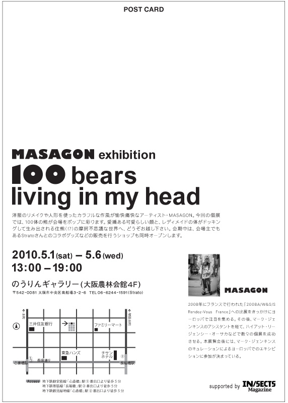 洋服のリメイクや人形を使ったカラフルな作風が愉快痛快なアーティスト・MASAGON。 今回の個展では100体のクマが会場を会場をPOPに彩ります。 愛嬌ある可愛らしい顔と、レディーメイドの体がドッキングして生み出される住熊(!?)の摩訶不思議な世界へ、どうぞお越し下さい。 会期中は、会場主でもあるStratoさんとのコラボグッズなどの販売を行うショップも同時オープンします。 =MASAGON= 2008年にフランスで行われた「2008A/W&S/S Rendez-vous FRANCE」への出展をきっかけにヨーロッパで注目を集める。 その後、マーク・ジェンキンスのアシスタントを経て、ハイアット・リージェンシー・オーサカなどで数々の個展を成功させる。 本展覧会後には、マーク・ジェンキンスのキュレーションによるヨーロッパでのエキシビションに参加が決まっている。