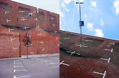 ドイツのある駐車場横の建物に施された駐車スペース。