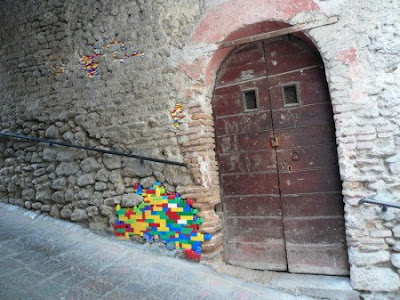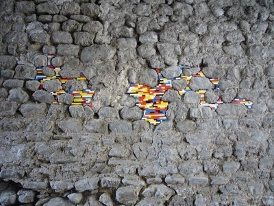 」による、古びた壁の隙間に「LEGO」を敷き詰めるストリートアート。
